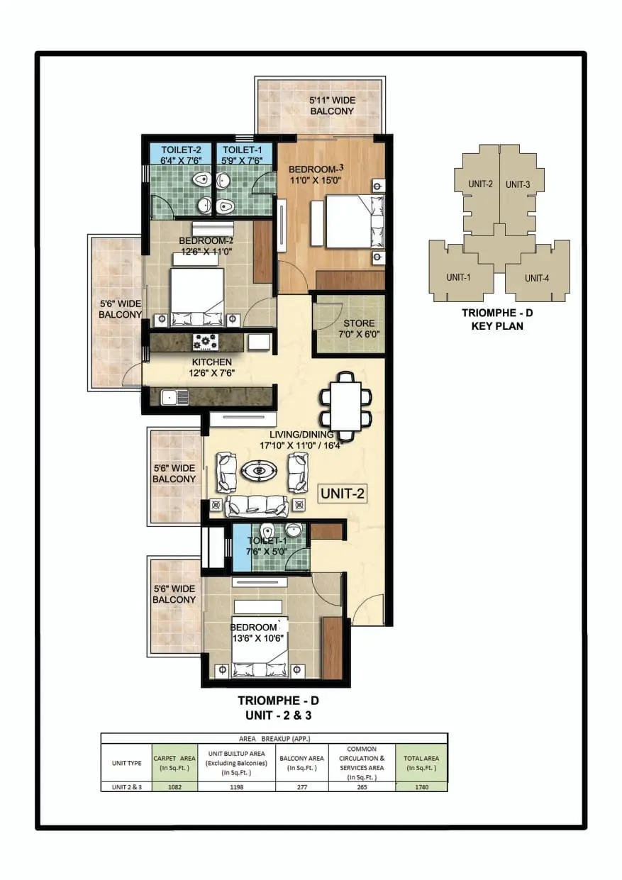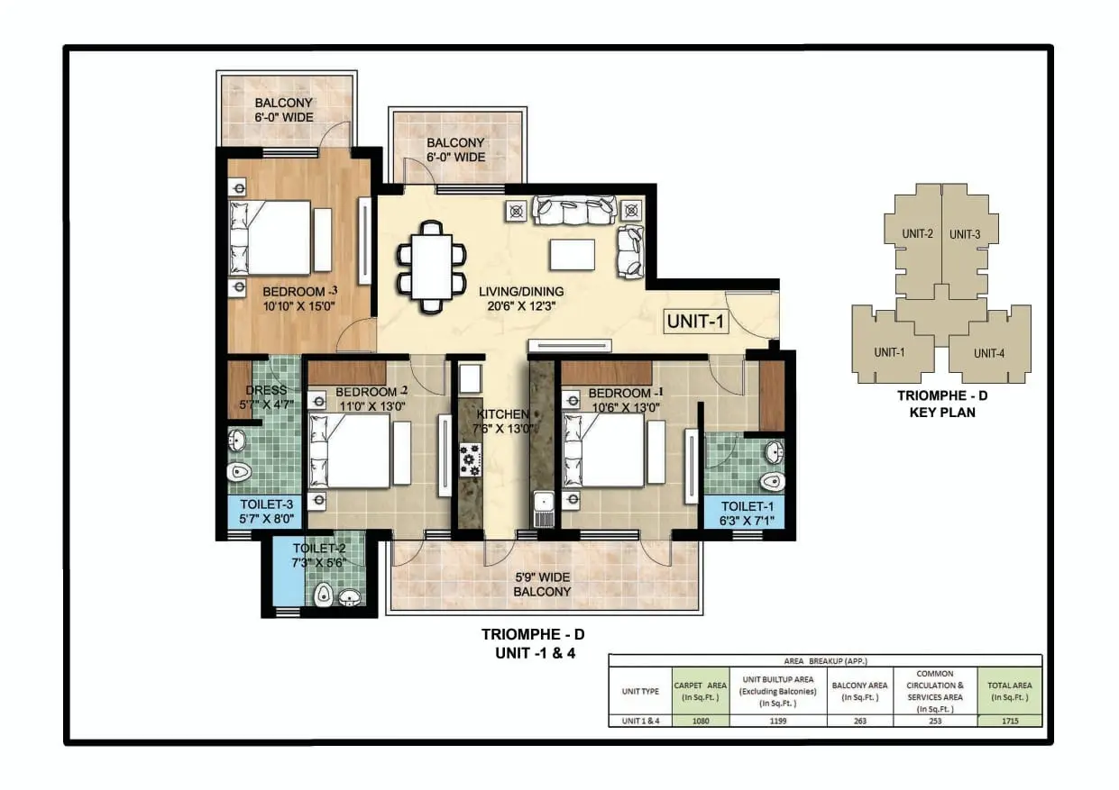 | Floor Type | Super Area (Sq. Ft.) | Carpet Area (Sq. Ft.) | Balcony Area (Sq. Ft.) | Approx. Pricing (INR) |