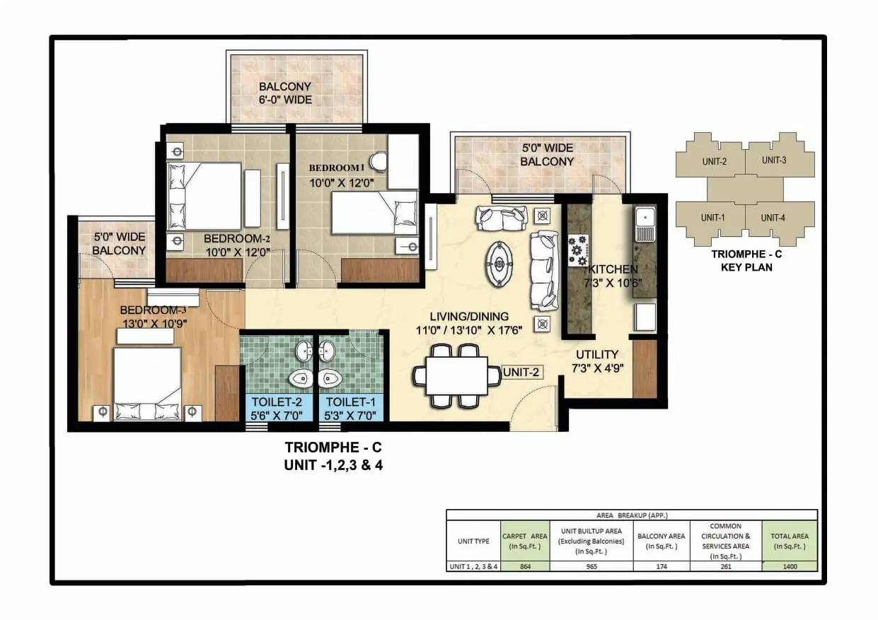 | 3 BHK + Utility | 2150 | 1720 | 200 | 1.70 Cr |