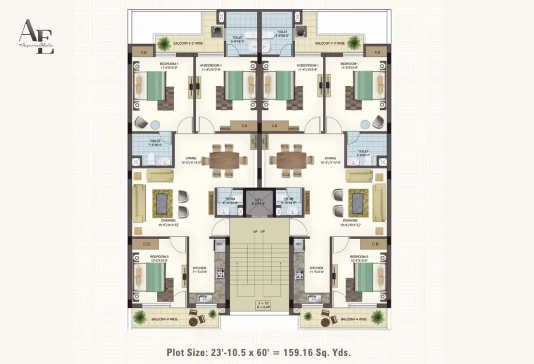 3 BHK independent floors are built on plots of 159.16 Sq. Yds. with approximately 1432 Sq. Ft. built-up area.