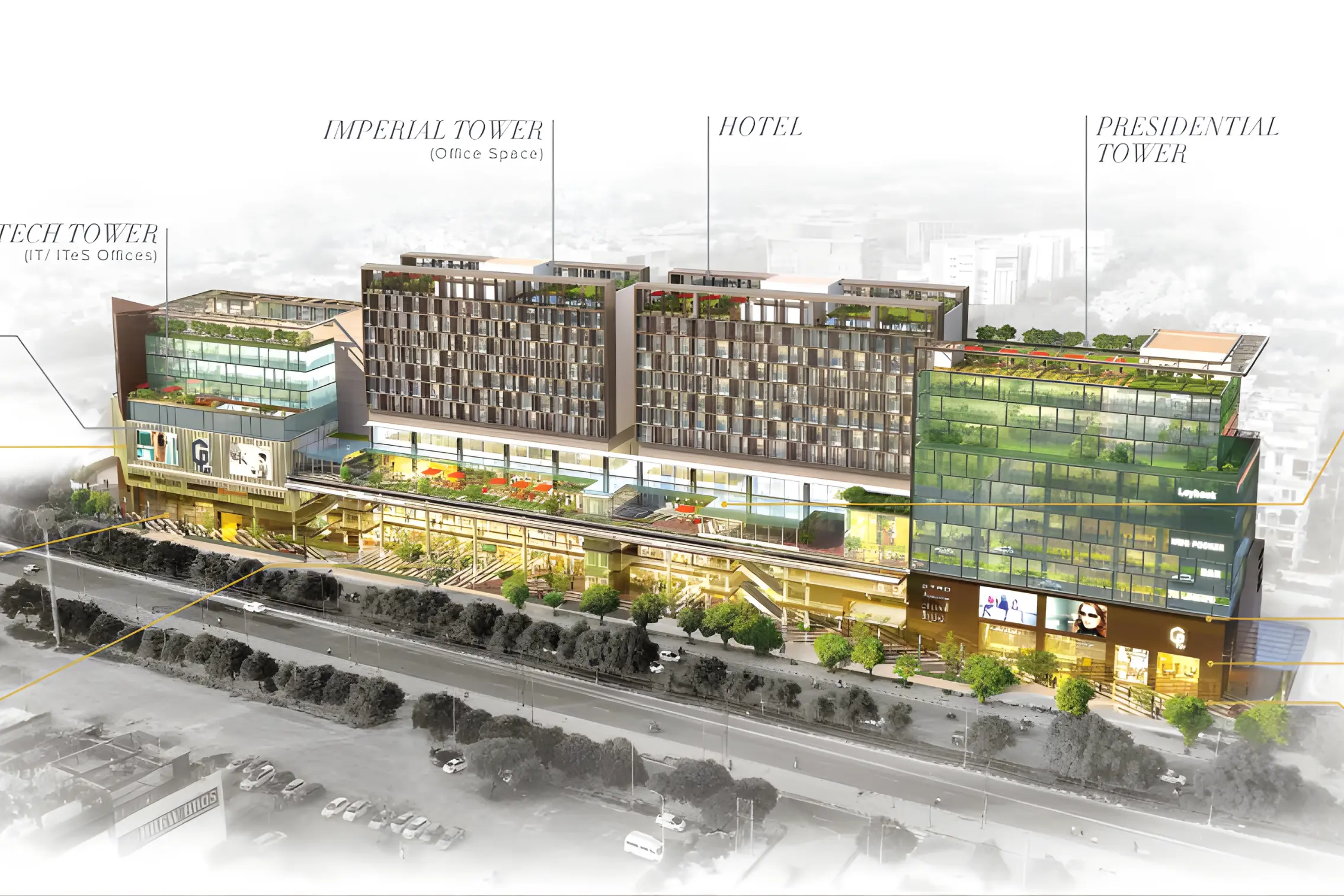 The project offers premium high-street retail spaces, modern office spaces, a multiplex entertainment zone, and hospitality suites. With iconic architecture and wide frontage on Airport Road, CP-67 provides unmatched visibility for brands and excellent investment potential for commercial buyers.