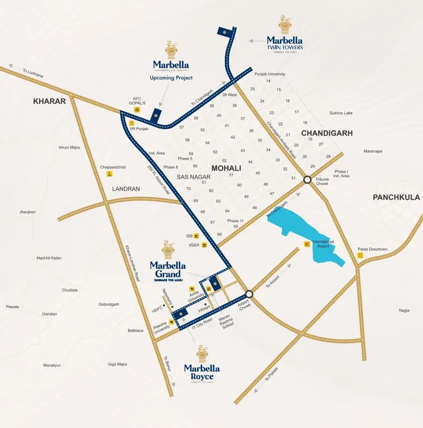 Marbella Royce, developed by the reputable SRG Group, stands as a premier luxury residential project in Sector 83A, Aerocity, Mohali. This high rise society features ultra-modern apartments designed for contemporary living, blending elegance with functionality. Located in the heart of IT City, it offers stunning views and seamless connectivity to key areas. As one of the best projects in Mohali, it caters to those seeking high rise flats in Mohali, high rise buildings in Mohali, and luxury residential projects in Mohali. With its strategic position near the Chandigarh International Airport, it's perfect for professionals and families exploring residential property in Mohali or upcoming residential projects in Mohali. RERA Number: PBRERA-SAS81-PR0391 (as per group projects; verify on Punjab RERA portal).