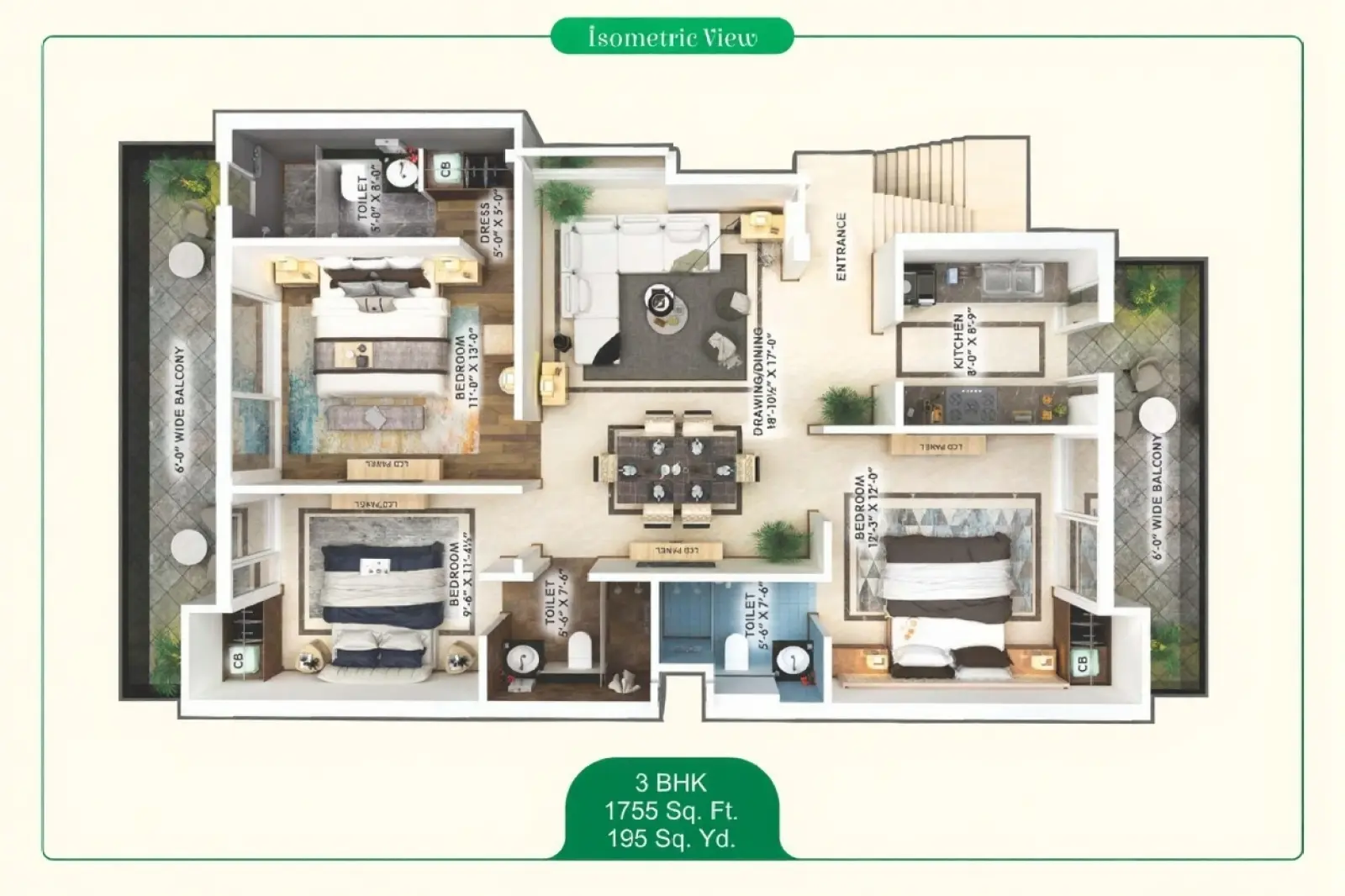| 3 BHK | 1755 | 1404 (approx.) | 150 | 69.50 Lac |