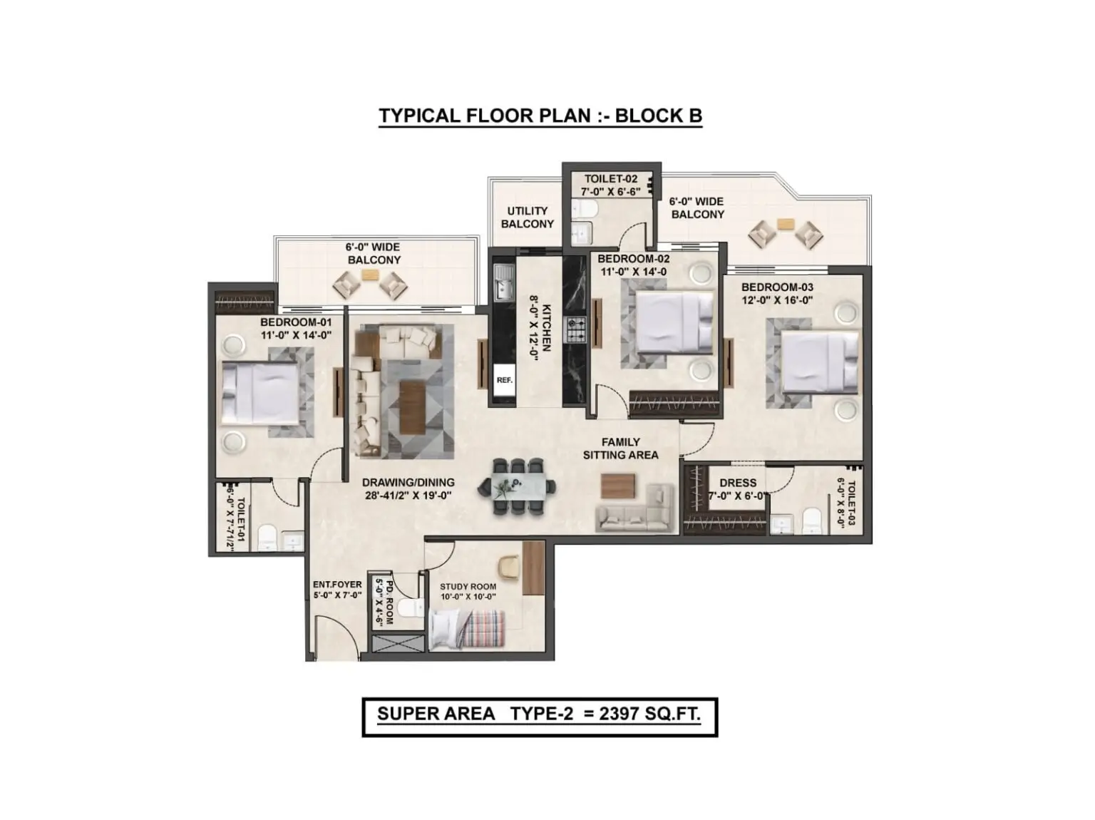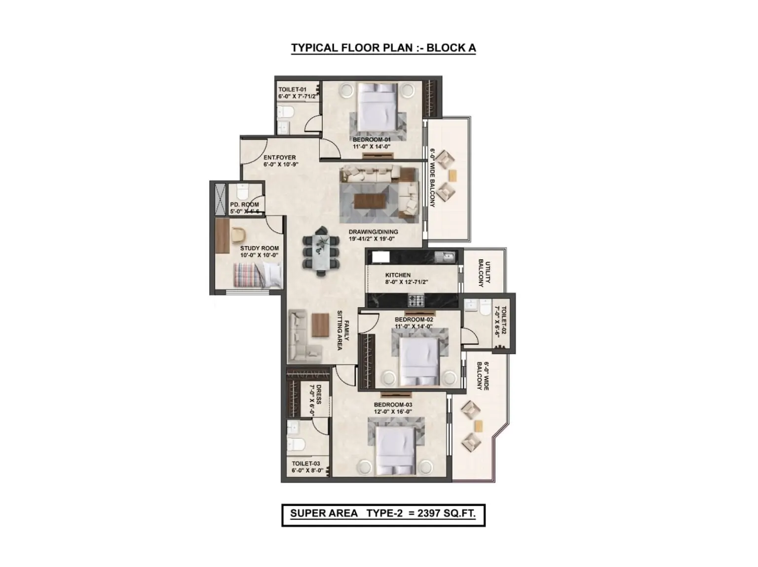 | 3 BHK + Study | 2397 | 1750 | 200-250 | 2.00 Cr - 2.50 Cr |