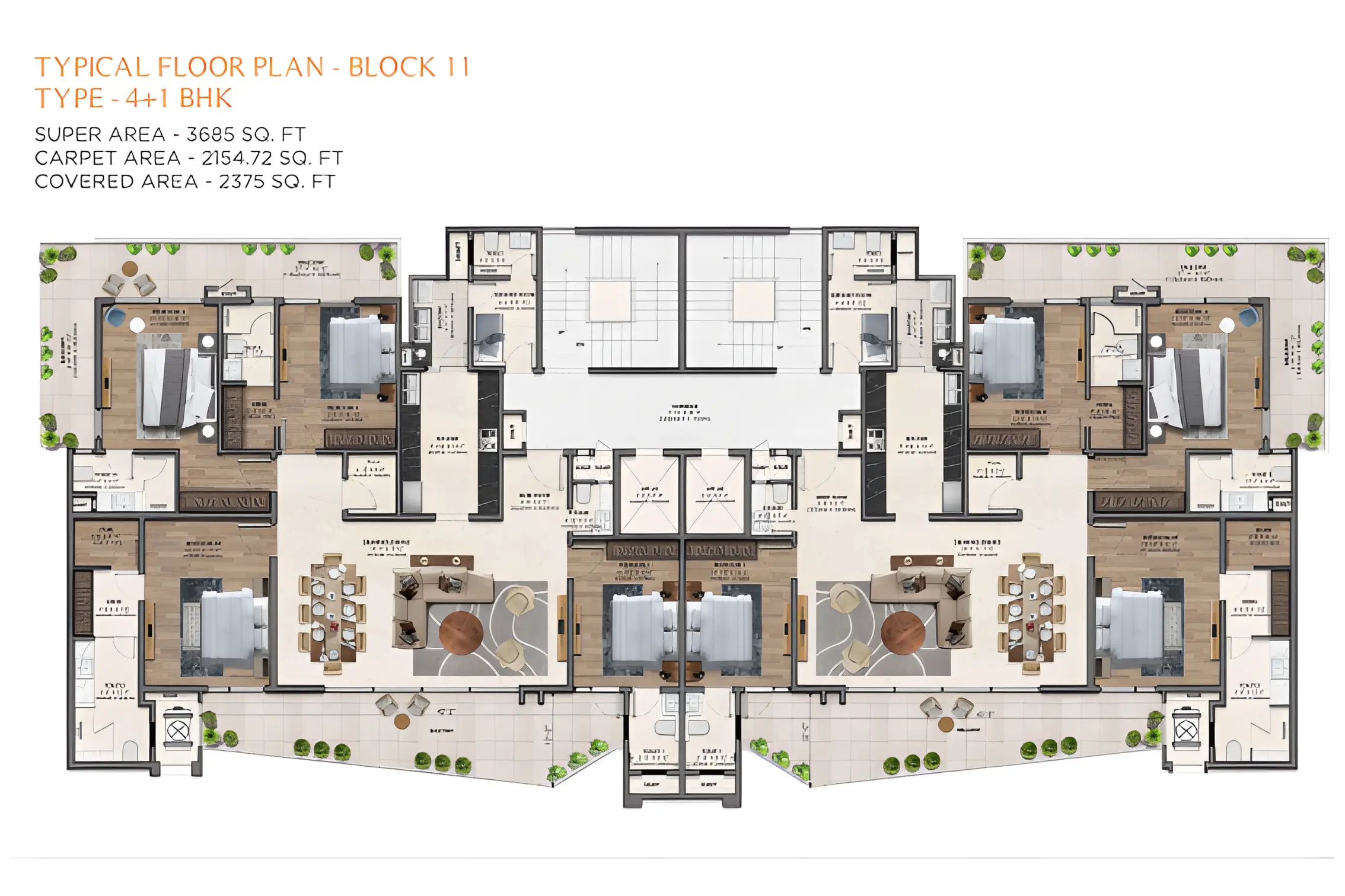 | 4+1 BHK | 3685 sq ft | 2154 sq ft | 2375 sq ft |