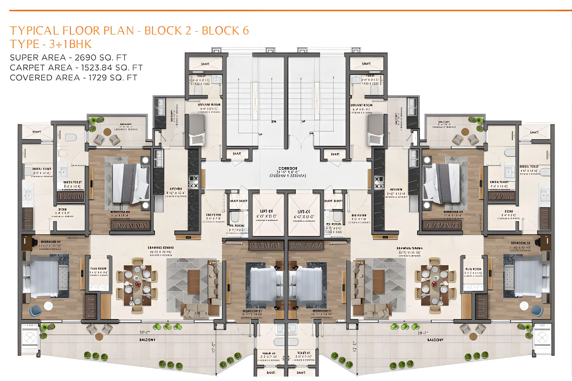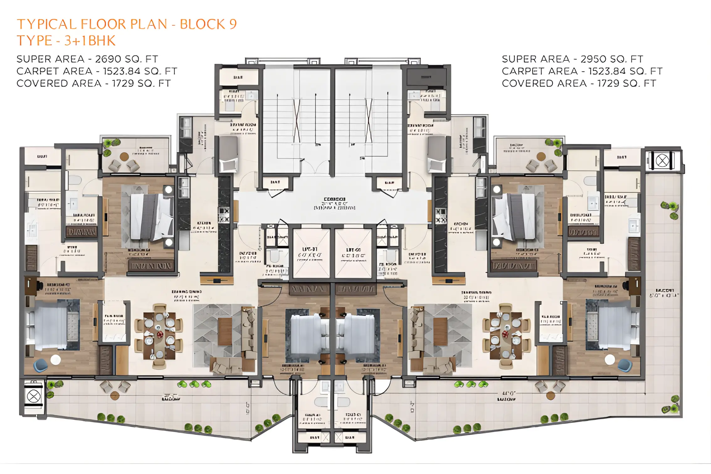 | 3+1 BHK | 2690 sq ft | 1523 sq ft | 1729 sq ft |