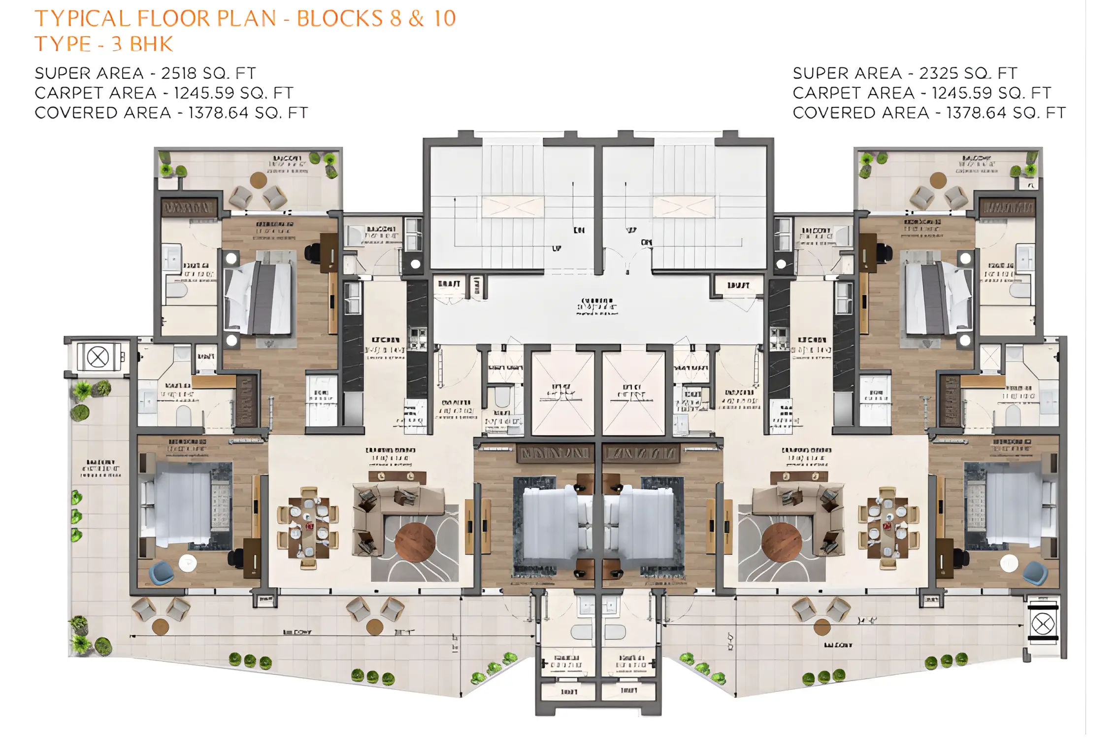 | 3 BHK | 2518 sq ft | 1245 sq ft | 1378 sq ft |