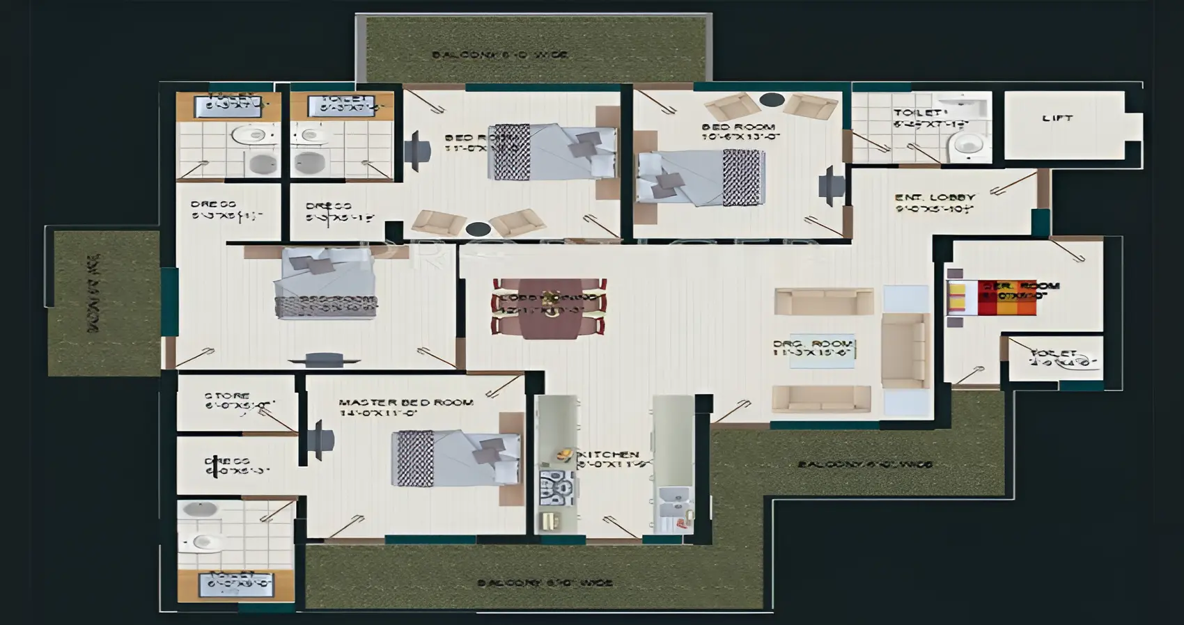| Floor Type | Super Area (Sq. Ft.) | Carpet Area (Sq. Ft.) | Balcony Area (Sq. Ft.) | Approx. Pricing (INR) |